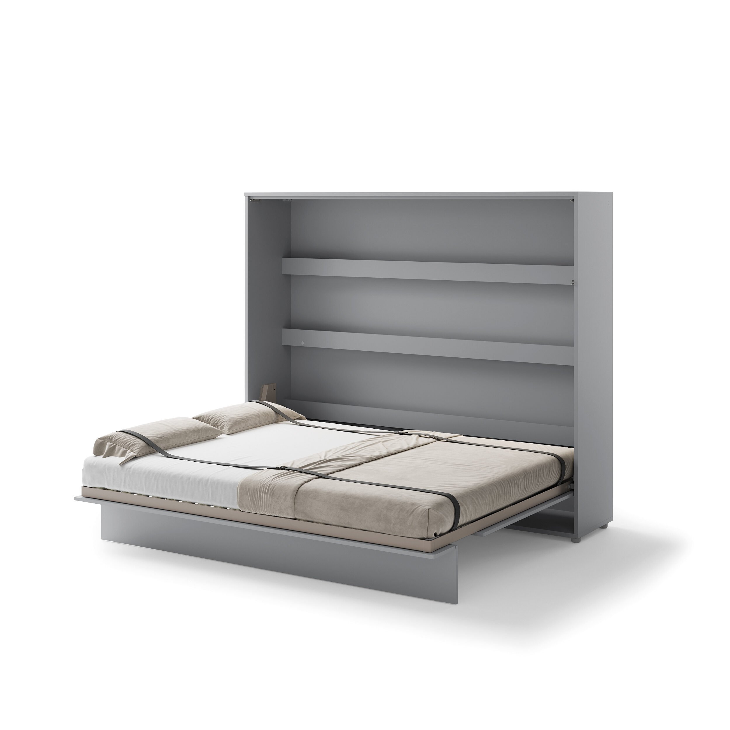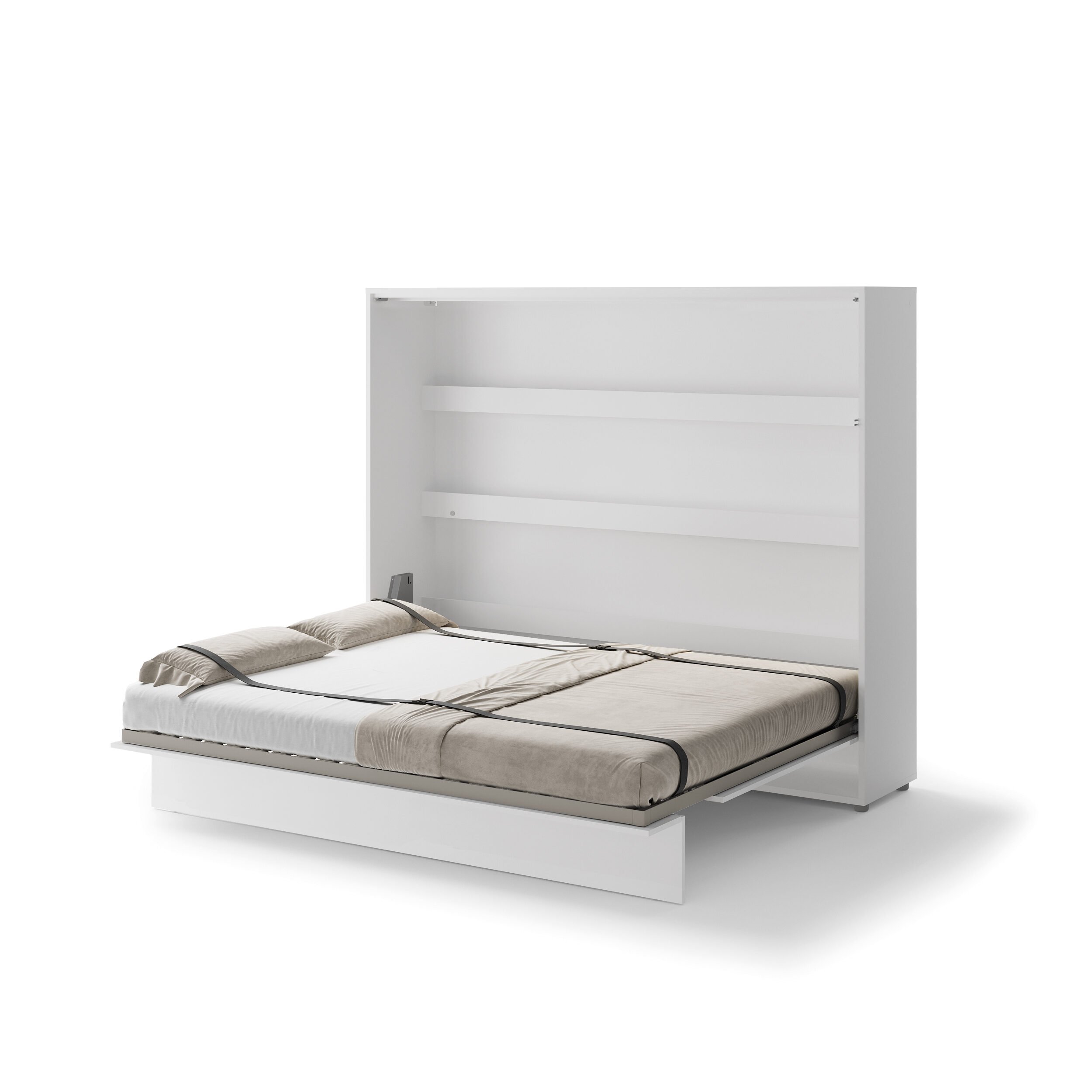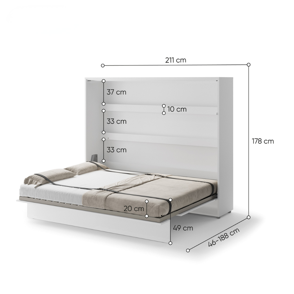 The bed box features a sturdy and reliable mechanism that opens smoothly and controlled by the gas springs present, requiring little force. This makes the bed easy to use. The slatted base provides good support and is suitable for a mattress with the bed size of 160 x 200 and with a maximum thickness of 20 cm. With the help of the included fastening straps, the mattress stays neatly in place during folding. If you want to be able to fold the bed including the duvet, we recommend a slightly thinner mattress. We cannot promise that you will also be able to fold up your pillow. This depends on the thickness of the mattress and the thickness of your pillow.