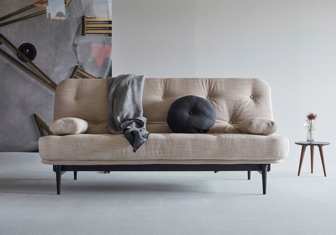 Bed sofa Colpus black belongs with the CLIC-CLAC systems to the functional transverse mechanism that can be put together completely in your own way. Colpus black stands for the chosen frame. In the case of this sofa, it is a black frame with a black wooden leg and without armrests. The CLIC-CLAC system programme gives you a choice of 6 different bases and therefore a choice of several leg and armrest options. You can choose from the following models: