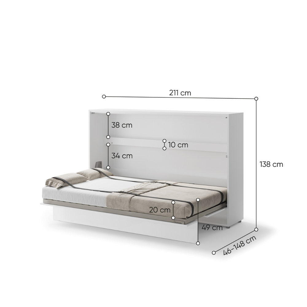 The bed box features a sturdy and reliable mechanism that opens smoothly and controlled by the gas springs present, requiring little force. This makes the bed easy to use. The slatted base provides good support and is suitable for a mattress with the bed size of 120 x 200 and with a maximum thickness of 20 cm. With the help of the included fastening straps, the mattress stays neatly in place during folding. If you want to be able to fold up the bed including the duvet, we recommend a slightly thinner mattress. We cannot promise that you will also be able to fold up your pillow. This depends on the thickness of the mattress and the thickness of your pillow.