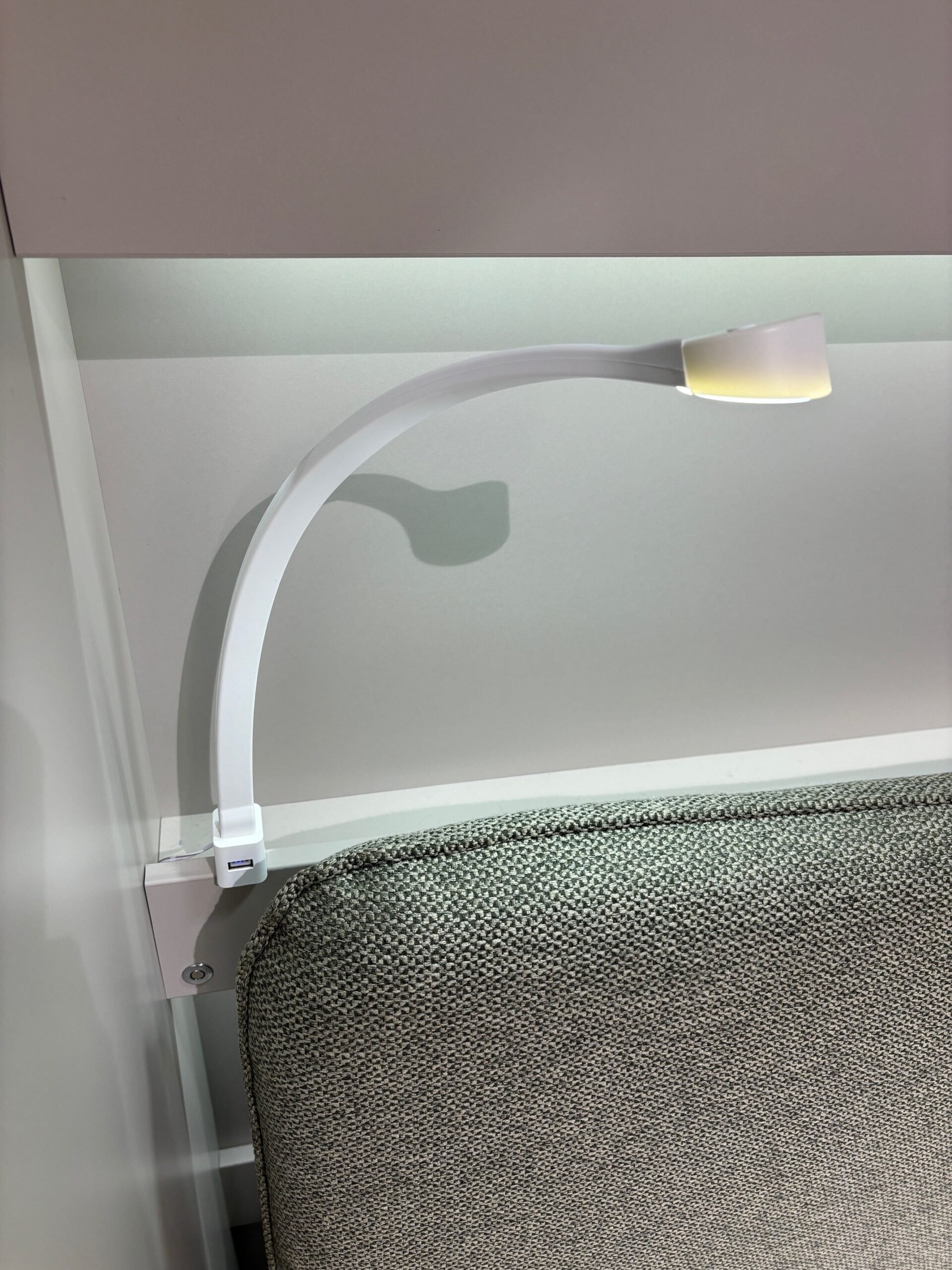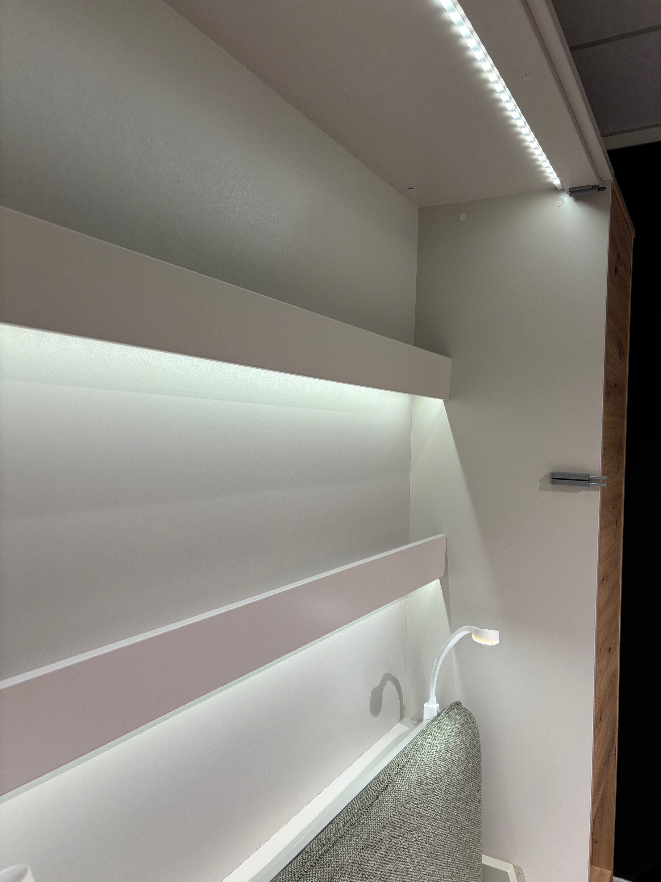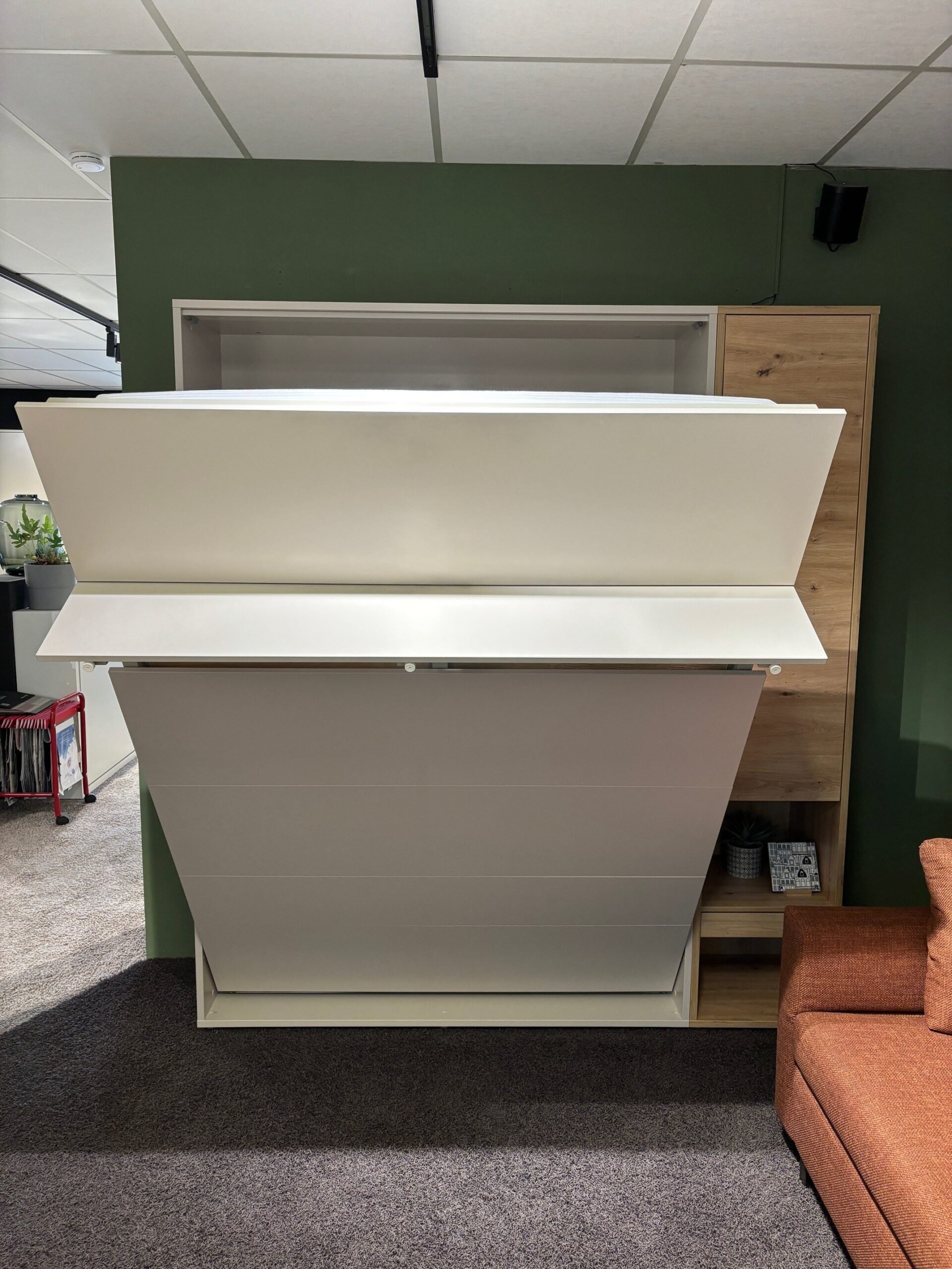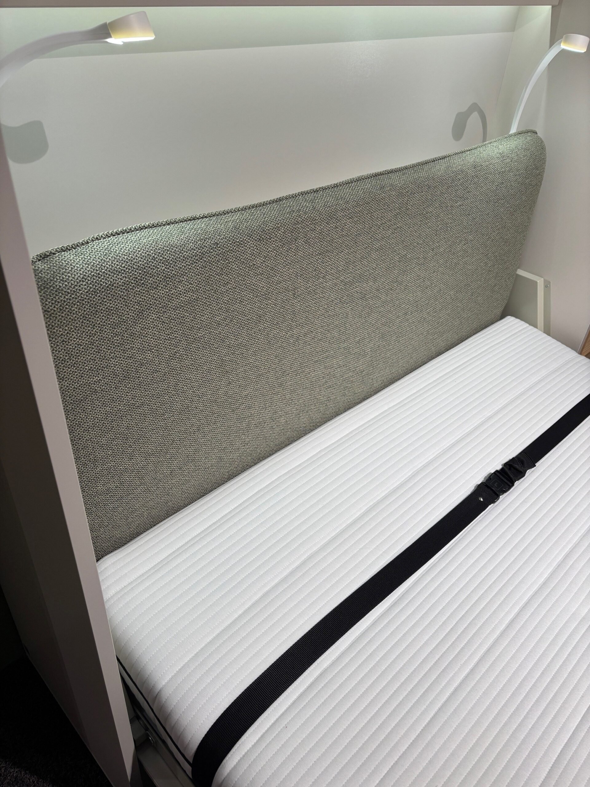 In addition, the showroom model also has dimmable LED lights in the internal shelves and 2 flexible LED lights with USB connection under the shelves. These USB LED lights are not dimmable. The light blue indicator light of the USB connection remains very slightly visible at night. Also included in the showroom model is a green upholstered headboard. The upholstered headboard is integrated into the folding bed. When you have unfolded the bed, simply put the headboard upright. This immediately creates a comfortable backrest for relaxed reading or watching television. The soft upholstery provides extra comfort and a warm look.