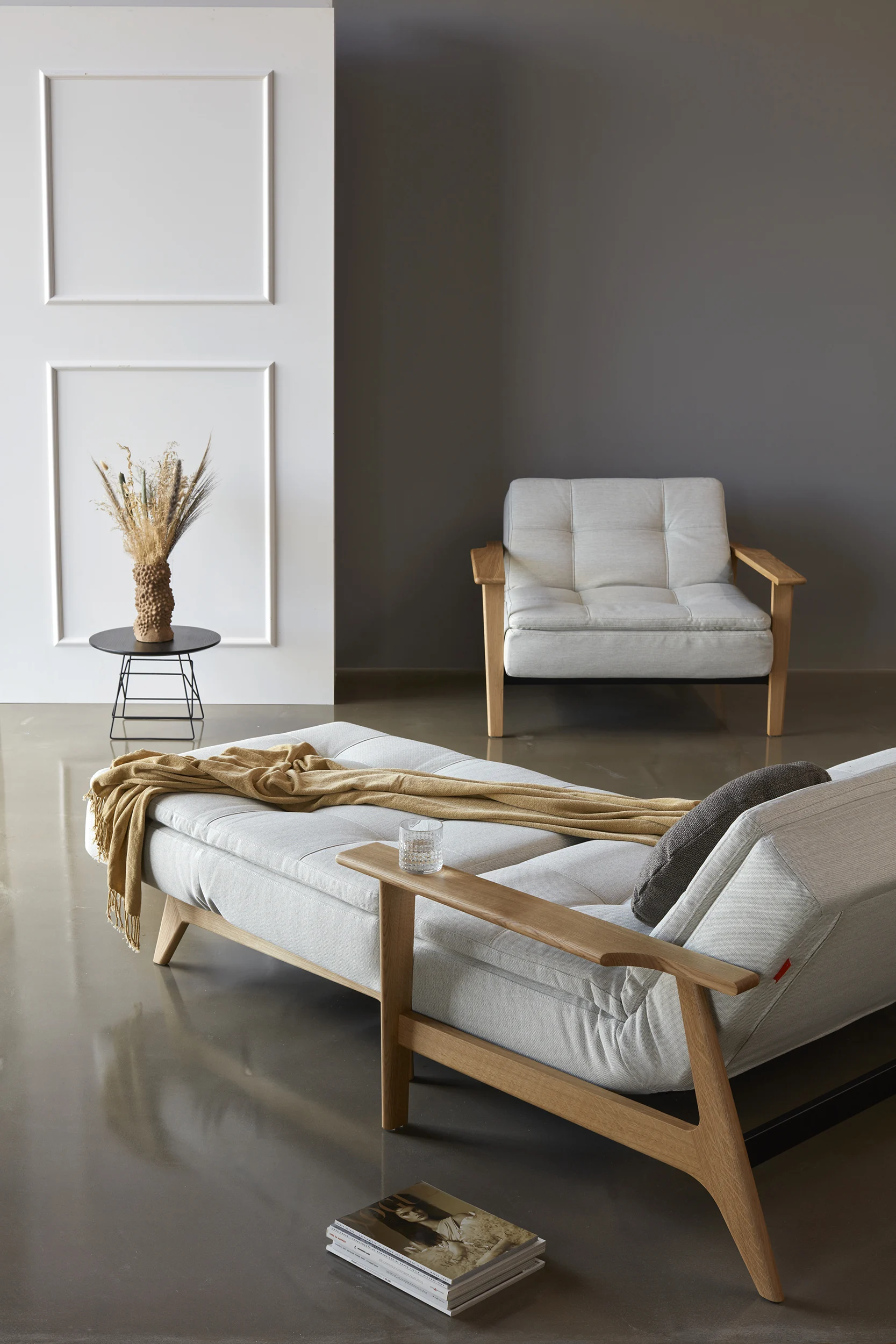 The Dublexo sofa bed is available in several stock colours, giving you the opportunity to choose the perfect one to match your personal style. The beautiful armrests made of oak wood create a warm and Scandinavian look. With a nice cushion to go with it, you can snuggle up in the corner!