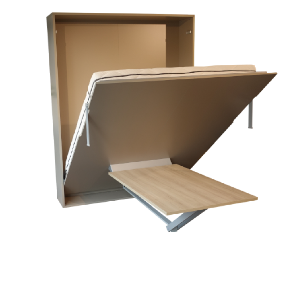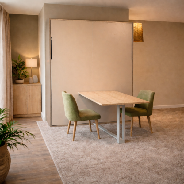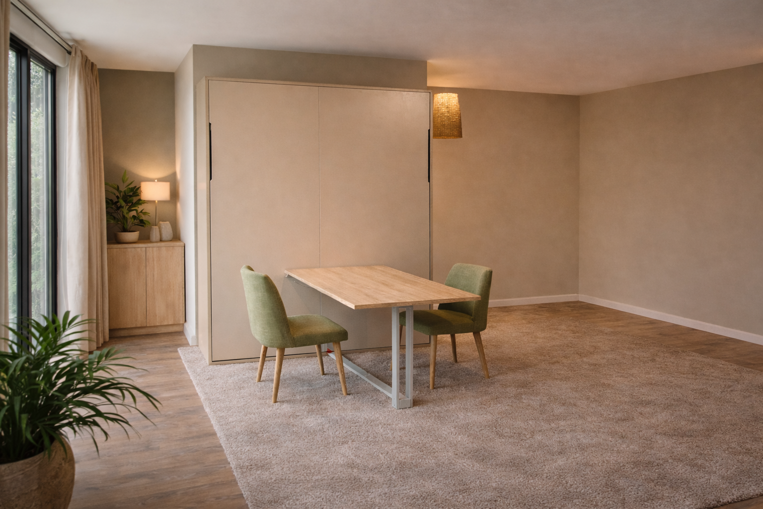 Maximaliseer uw leefruimte met een praktische geïntegreerde tafel die ’s avonds soepel verandert in een comfortabel bed.