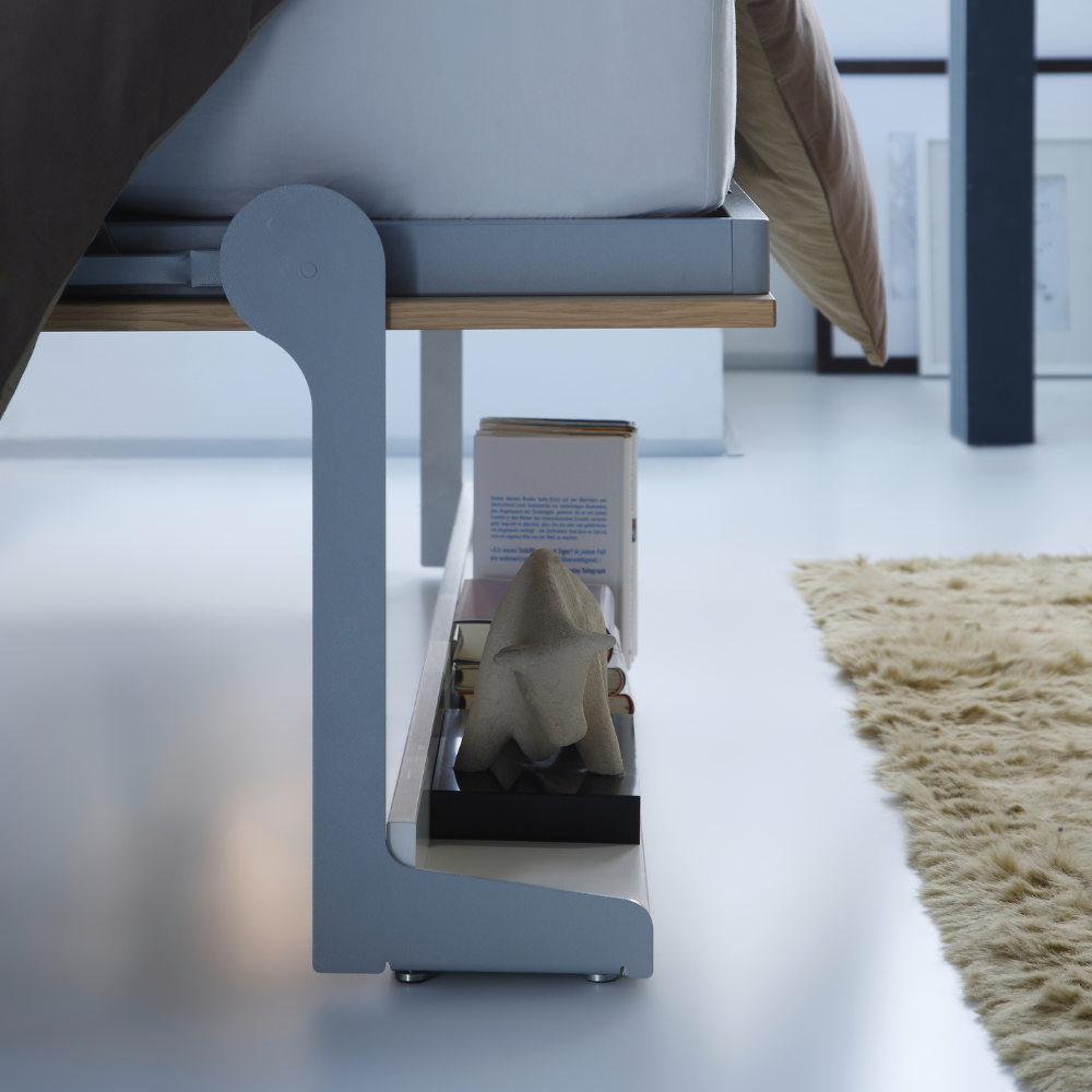 Opklapbed Space kenmerkt zich door een uitstekende kwaliteit en een fijne bedhoogte. De hoogte van dit bed is hoger dan de meeste opklapbedden zijn, dus ideaal als u niet te laag bij de grond wilt liggen en gemakkelijk wilt kunnen in- en uitstappen. Exclusief matras is de bedhoogte 50 cm van de grond, tel daar bijvoorbeeld een matras van 18 cm dikte bij op en dan ligt u op 68 cm hoogte van de grond! Een ander kenmerk van dit opklapbed is de plankpoot aan de voorkant. Op deze plankpoot kunt u wat accessoires zetten met een stabiele bodem. Bij het openklappen van het opklapbed kunt u deze spullen gewoon laten staan! Het mechaniek is eenvoudig te bedienen en kost weinig kracht. De gasveren nemen het op een gegeven moment van uw over en zorgen dat het bed gemakkelijk uitklapt. Het opklapbed Space is uitermate geschikt voor dagelijks gebruik. Het opklapbed is geschikt voor een matras tot 20 cm dik. Wilt u het bed opgemaakt kunnen inklappen? Kies dan voor een iets dunner matras. Het dekbed kan dan dankzij de aanwezige bevestigingsbanden netjes worden meegeklapt.
