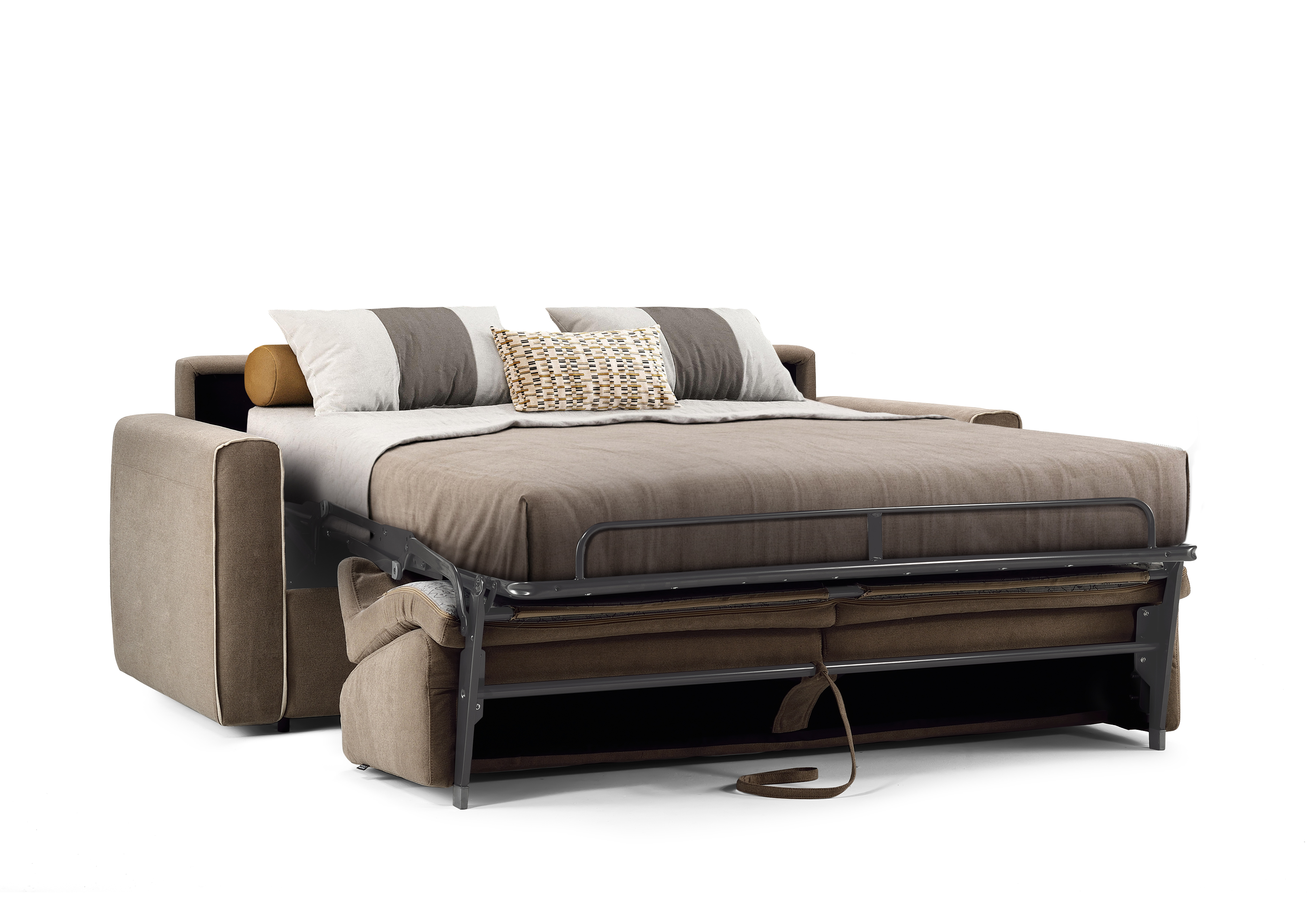 Slaapbank Badaboom is onze slaapbank met het dikste matras. De slaapbank wordt namelijk standaard geleverd met een pocketveringmatras van maar liefst 20 cm. dik! Standaard ligt het matras op een metalen raster, maar kan tegen meerprijs ook met een stabiele lattenbodem geleverd worden. Slaapbank Badaboom met het Royal mechaniek.is een slaapbank die geschikt is voor dagelijks gebruik. U verandert de bank moeiteloos naar een comfortabel bed. Het hoeslaken en de molton kan om het matras heen blijven zitten tijdens het in-en uitklappen. Achter de rugkussens is er ruimte om de hoofdkussens op te bergen. Het dekbed zult u ergens anders op moeten bergen.