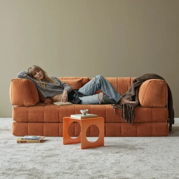 Slaapbank Cozypad with arms is een modulair lounge- en slaapsysteem dat maximale vrijheid biedt. De basis bestaat uit twee HR30 schuimmatrassen van 100 x 200 cm die los op elkaar liggen. Hierdoor wissel je moeiteloos tussen zitbank, lounge-opstelling, bed of een royaal eiland. De vormgeving heeft een subtiele retro look, geïnspireerd op informele zitlandschappen uit de jaren zeventig. De rug- en armleuningen zijn losse kussens die u plaatst waar u ze nodig hebt. De slanke metalen steunen schuift u eenvoudig onder de matrassen en geven ondersteuning zonder het ontwerp te verstoren. Alles is verplaatsbaar, niets ligt vast. Cozypad nodigt uit tot ontspannen. Lekker hangen, loungen, spelen, zitten of tv kijken. Overdag een informele lounge, ’s nachts een riant bed. Ideaal voor flexibel wonen en multifunctionele ruimtes. Standaard leverbaar in drie zorgvuldig gekozen stoffen. Cozypad with arms is geen vaste slaapbank, maar een systeem dat zich aanpast aan uw manier van leven. Eventueel is het ook mogelijk om de Cozypad chair toe te voegen. Hierdoor ontstaan er extra opstellingen, zoals een hoekopstelling of een verlenging van de slaapbank.