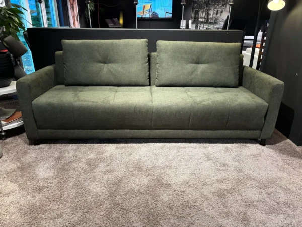 Wat deze slaapbank echt bijzonder maakt, is het gebruiksgemak: je klapt het bed uit in één soepele beweging, u hoeft alleen eerst de rugkussens te verwijderen. Het hoeslaken kan tijdens het in- en uitklappen blijven zitten. Het dekbed en de kussens moet u elders opbergen. Het showroommodel is uitgevoerd in een mooie donkergroene stof. Kom hem snel bewonderen in onze showroom, want dit unieke showroommodel is slechts één keer beschikbaar. Op = op!