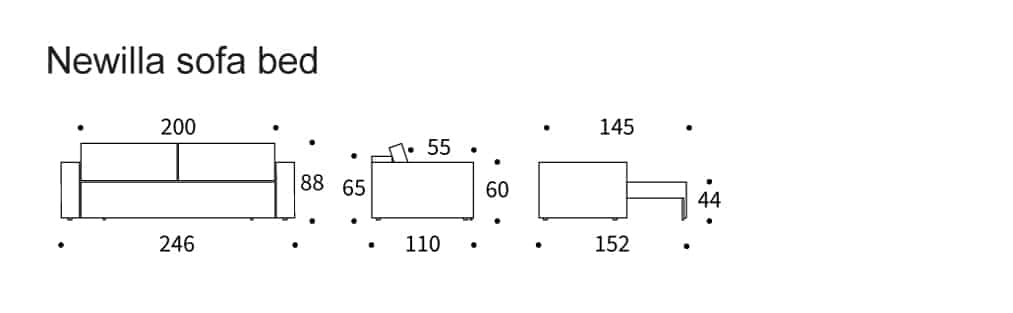 De zitting kan moeiteloos naar voren worden geschoven en het rug deel kan vervolgens naar beneden worden geklapt. Hierdoor ontstaat er een bed met de afmetingen van 145 x 200 cm verdeeld over 2 bed delen.