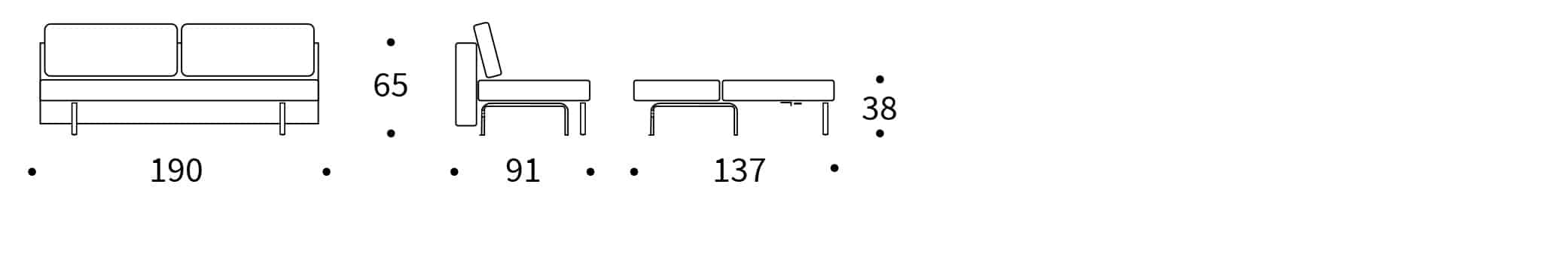 Met gemak transformeer je deze bank tot een bed. Als je de rugkussens weghaalt ontstaat er al een klein 1 persoonsbed. Vervolgens is het een kwestie van het zitdeel naar voren trekken en het rugdeel erbij klappen. Er ontstaat dan een bed van 137 cm x 190 cm verdeelt over 2 beddelen.
