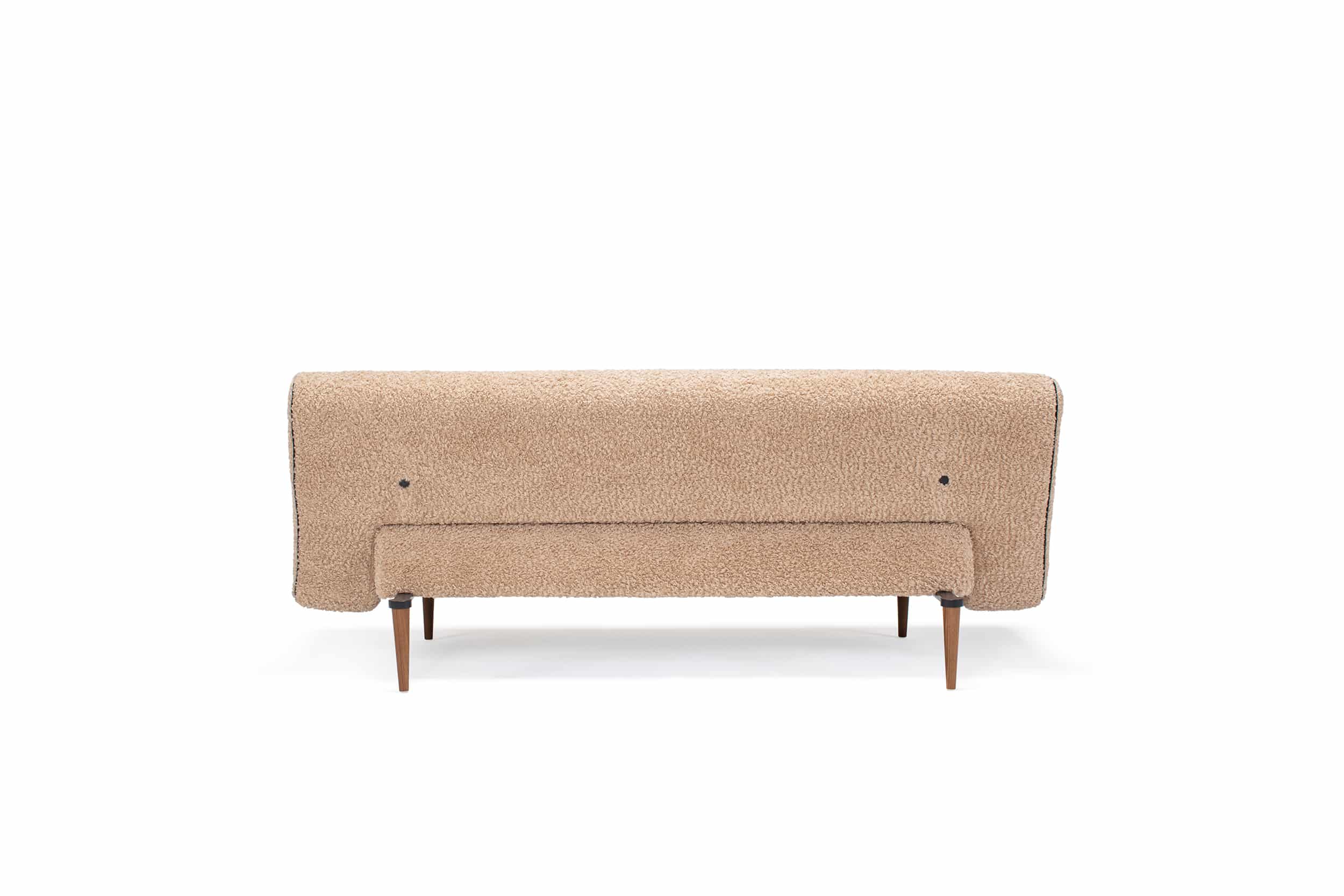 De slaapbank Unfurl valt op door zijn mix van retro en modern design, met een strakke uitstraling en een speelse jaren ’80 touch. De tapse poten van donker hout geven de luxe slaapbank een elegante look.